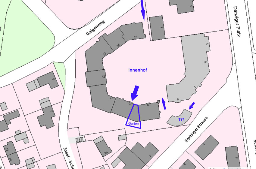 Zugang in den Innenhof von der Erpftinger Straße und vom Galgenweg aus.